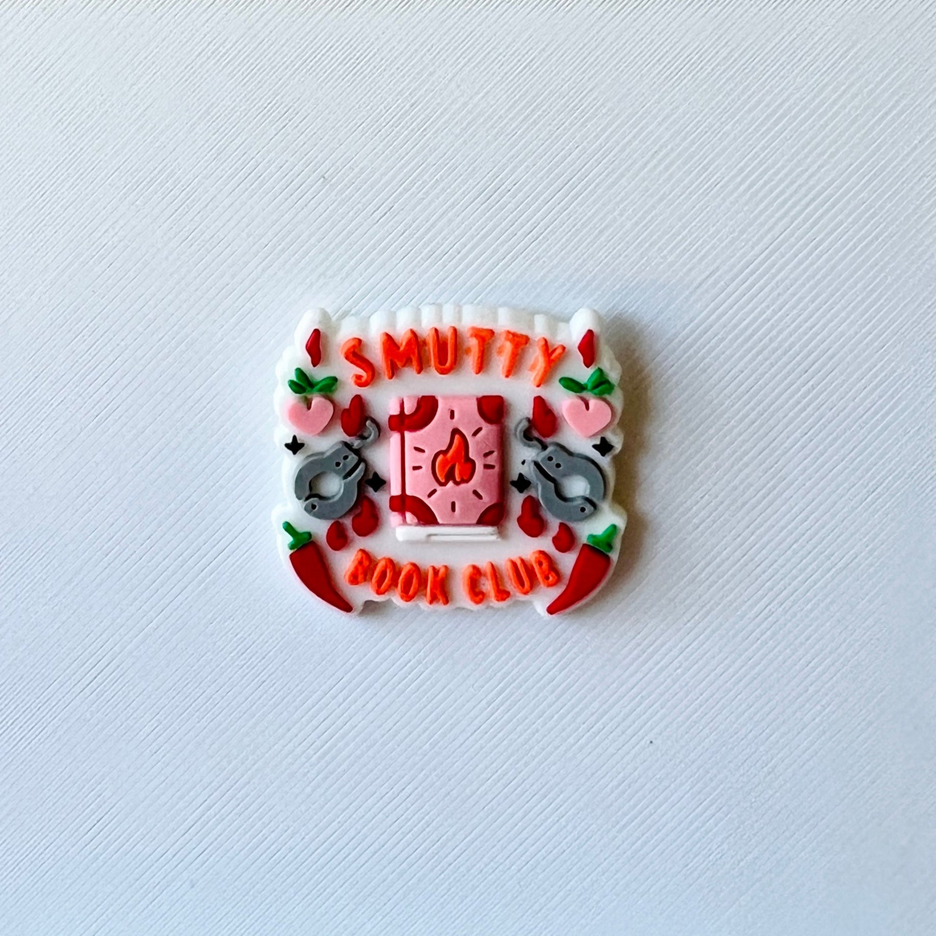 Our Smutty Book Club Shoe Charm is the perfect nod to your guilty pleasure reads. Featuring a mini book design with handcuffs and a chilli pepper (because yes please), this charm is made for the readers who like it a little extra.